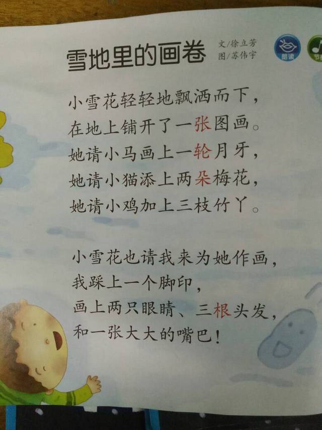 今日亲子阅读,动态阅读第五册第12页《雪地里的画卷》。家长引导幼儿阅读,并且将相应的字词拆下来。巩固字词的认识
