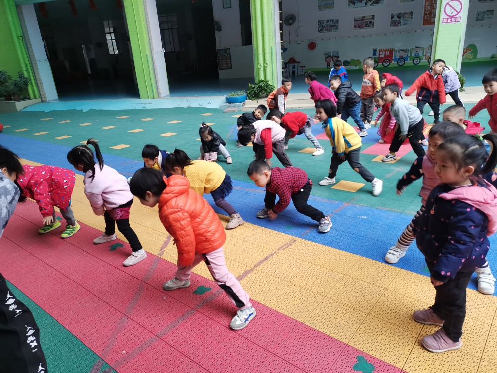 相片描述:小朋友跟着体能哥哥学习拍球