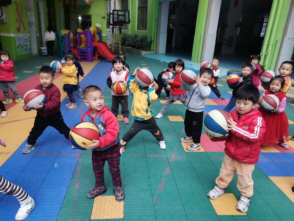 相片描述:小朋友跟着体能哥哥学习拍球