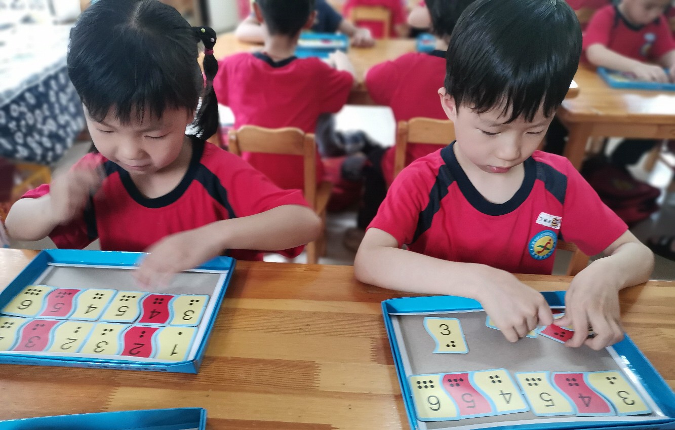 相片描述:孩子们认真地操作数字卡片