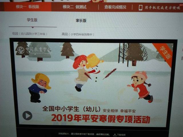 请家长们抽空登录安全教育平台陪同小朋友完成2019年平安寒假活动作业。作业有两个模块: 第一个模块是看视频;第二个模块是做测试,两个模块都要完成,谢谢大家的配合[抱拳][抱拳][抱拳]