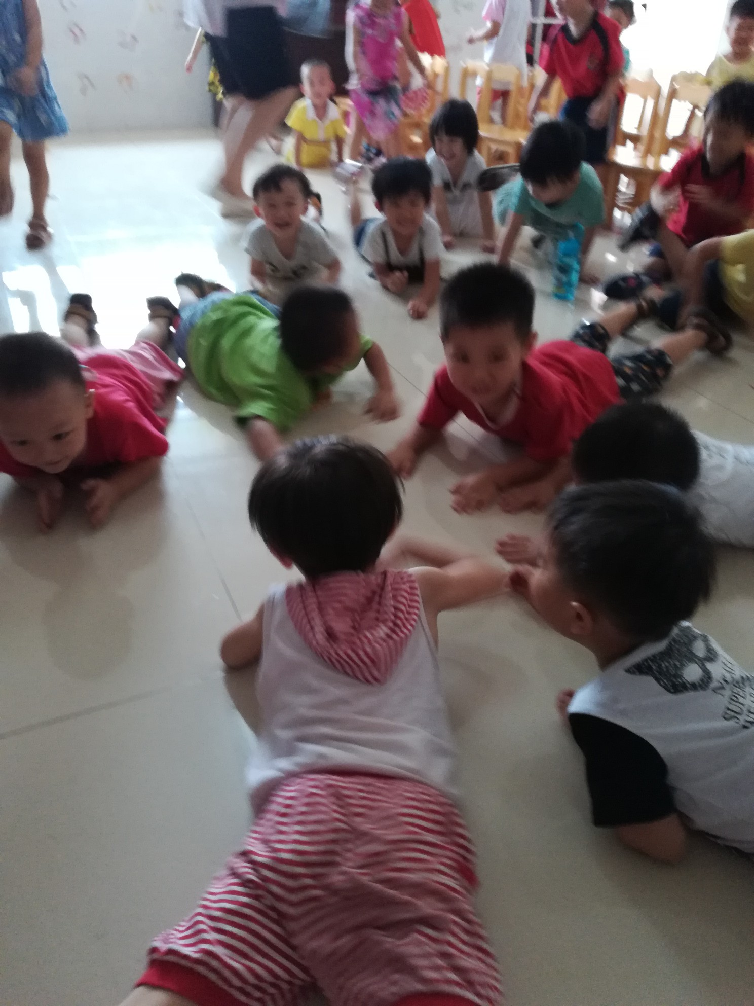 相片描述:小朋友学着海豹行走,学的多像