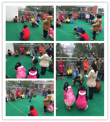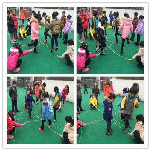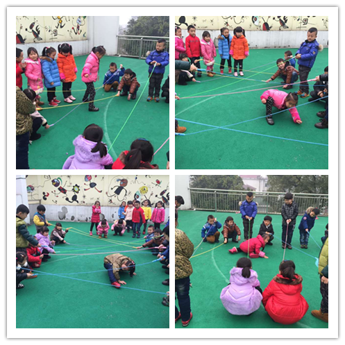 游戏背景:跳绳是幼儿喜欢的游戏道具,也是大班幼儿一项重要的体育技能。最近的教学计划中就有花样玩绳:跳、蹦、钻等都是比较常见的游戏方式。于是结合我们自己班的体育特色,将跳竹竿与跳绳融合,跳绳当作竹竿是不是更有挑战呢?穿越火线也具有不小的挑战哦。 游戏目标: 1、培养幼儿的节奏感,喜欢玩绳的乐趣; 2、锻炼幼儿的耐心、观察力和身体协调性。 游戏准备:跳绳若干 游戏玩法: (一)跳绳舞:两两幼儿合作拉直两根跳绳蹲好,另两名幼儿合作拉直跳绳与前两名幼儿的跳绳交叉蹲好,四名幼儿分别站在四个角。两两对应拉绳的幼儿跟节奏:跳绳打开、并拢,打开、并拢重复;跳绳的四个幼儿则在打开时将一只脚放到自己右边的两根跳绳中间,并拢时收回来,再打开时两只脚跳到跳绳中间然后跳到下一个角,重复进行。 (二)穿越火线:两个小朋友合作,一人拉住跳绳的一头对面站好 ,一排站六七个小朋友,然后不按规则进行“排兵布阵”,蹲着将跳绳拉低的,站着拉高的,两组跳绳交叉的。摆好之后请幼儿挑战,从起点开始,行进时可跳、趴、钻等,但身体不能碰到“火线”,否则就失败,反之成功,下一个小朋友继续。 游戏反思:第一个游戏幼儿有基础,本来就喜欢跳竹竿舞,因此对节奏、规则的把握还是比较不错的。不过由于竹竿是硬的,跳绳有韧性,这也就自然给游戏增加了难度。一开始跳的时候容易绊到跳绳,几次尝试之后就好多了。第二个游戏更有挑战性,不少幼儿都因为不小心碰到“火线”而失败,有了前面失败的经验,后来游戏的幼儿都更谨慎了,充分利用和调动身体各个部位,使自己顺利成功通过游戏过程中,我还不断调整“火线”的位置来增加难度和趣味性。
