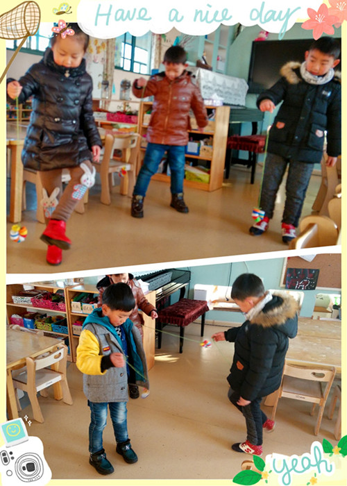 游戏背景:在中班的时候,我们就利用瓶盖制作了几种游戏材料投放到区角中,孩子们不仅喜欢,还能从中玩出更多的花样来。益智区的瓶盖数字比大小、连连看、五子棋是百玩不厌。这不,有孩子想尝试用脚玩出什么新的游戏,于是我们将瓶盖串在一起用绳子连接,制作出瓶盖毽子。 游戏目标: 1、能初步掌握用脚踢到瓶盖的技巧,体验快乐。 2、锻炼幼儿手、眼脚的协调能力。 游戏玩法: 用手勾住绳子的一端,先用脚的内侧去踢捆在绳子另外一头的瓶盖,踢一次再接着用脚继续踢一次,并且和同伴一起踢,边踢边数,看谁踢得多。熟练后可以用脚的外侧踢,还能左右脚连续踢。 游戏反思:这个踢瓶盖的游戏和我们传统的踢毽子游戏很相似,只是用一根绳子连接,更易于幼儿练习踢的技巧。才接触时,瓶盖毽子总是转来转去的不听指挥,但学会了之后,幼儿的兴趣变浓。特别是加入分组比赛的环节后,幼儿的兴趣更浓,而且瓶盖在踢的时候发出的响声也能吸引幼儿的注意。