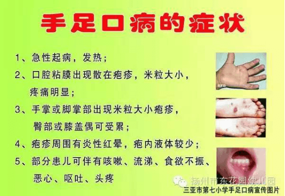 该病的传染源为病人和隐性感染者,主要经粪—口和/或呼吸道飞沫传播,也可经接触病人皮肤、粘膜疱疹液而感染。病人粪便、疱疹液和呼吸道分泌物及其污染的手、毛巾、手绢、牙杯、玩具、食具、奶具、床上用品、内衣以及其它器具等均可造成本病传播。大多数患者症状轻微,以发热和手、足、口腔等部位的皮疹或疱疹为主要特征,少数患者可并发无菌性脑膜炎、脑炎、肺水肿和心肌炎等,个别重症患儿病情进展快,可发生死亡。