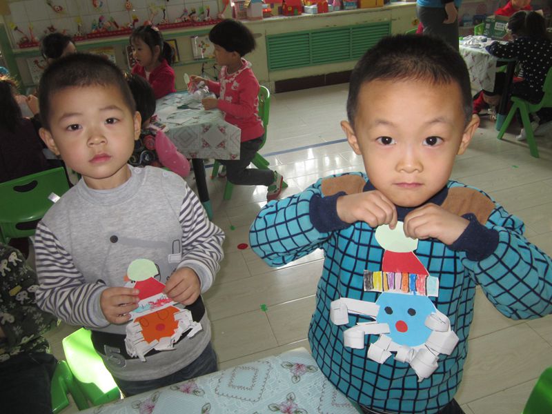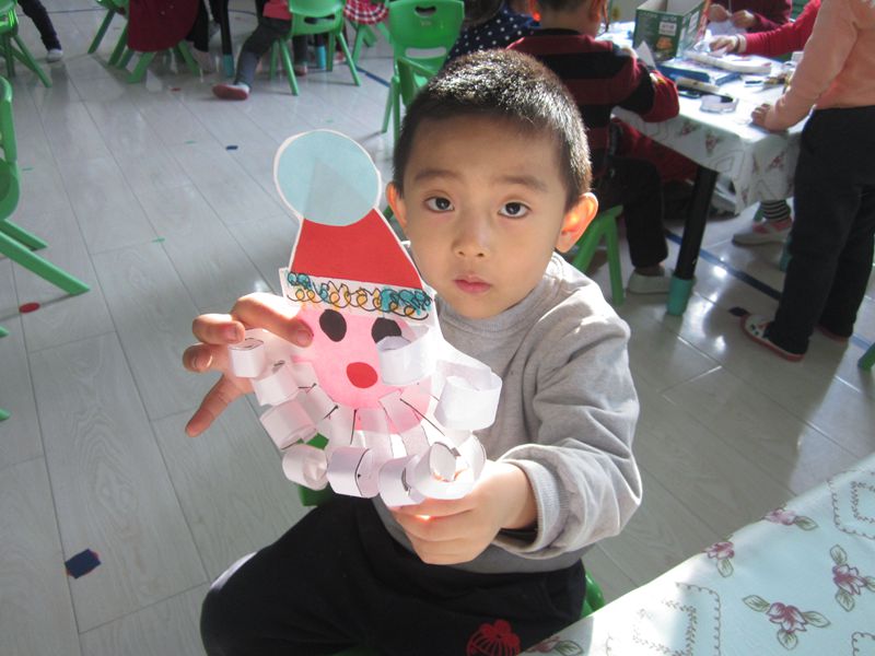 “圣诞节”作为一种时尚节日,它让我们联想到的是富有童趣的圣诞老人,可爱的驯鹿,五彩缤纷的礼物,纷飞的雪花,当然还有数不尽的欢乐,这样的一个充满快乐的节日早已淡化了它的宗教色彩而为更多的人所接受,孩子们能感受“圣诞节”的到来吗?当然,你看最近在大街小巷的商店橱窗上,柜台上都充斥着太多关于圣诞节的物品,敏感的孩子早已发现了,因为在孩子们的话题中多了许多关于圣诞节的话题,最近有的孩子带来了圣诞树及装饰物,圣诞帽等,让这个话题变得更有意思,孩子们会问到“圣诞老人是怎么分礼物的?”“圣诞老人会给我送礼物吗?”“圣诞节是不是和新年一样等等?”为了让孩子们对圣诞节有深刻的了解,我们一起分享绘本《什么是圣诞节》、《圣诞节的礼物》、《圣诞老公公》等并一起布置班级环境,制作圣诞老人,孩子们进一步感受到了欢乐、自由的情感。