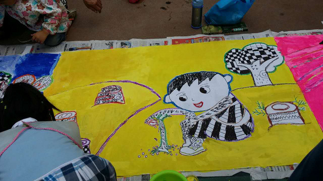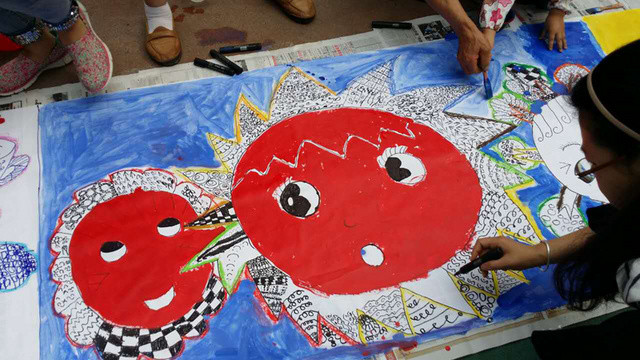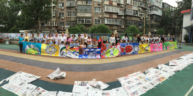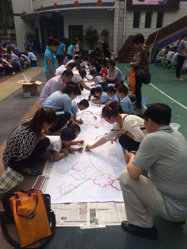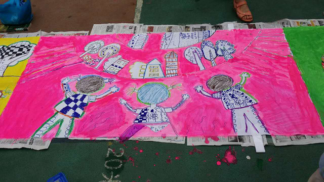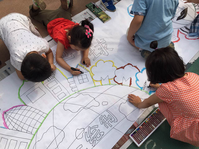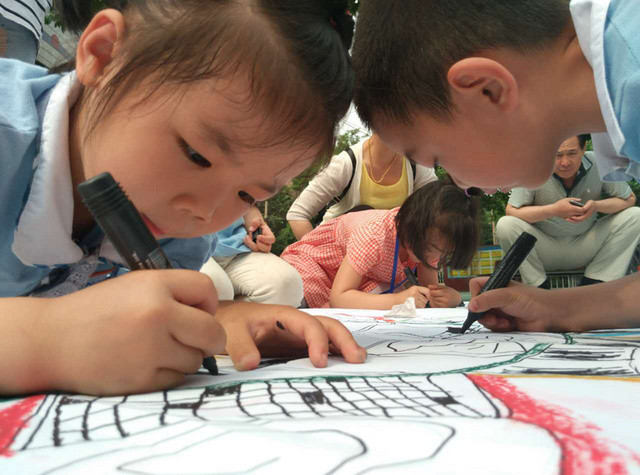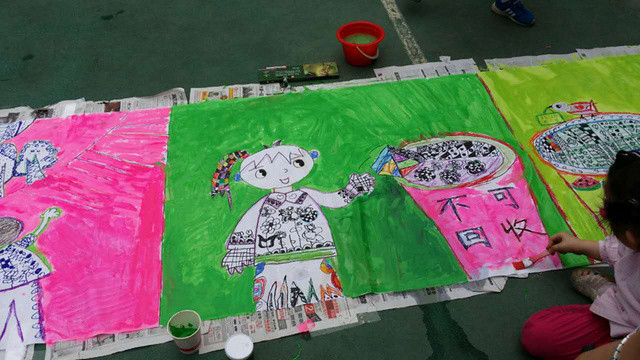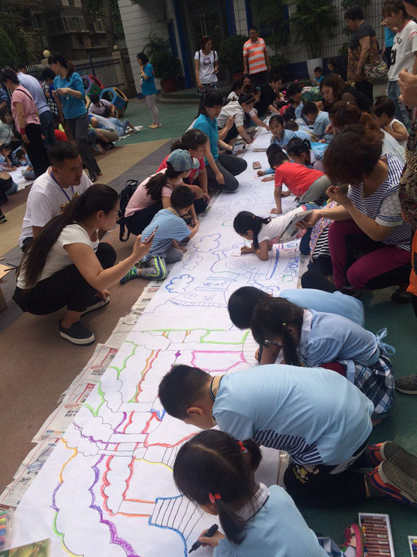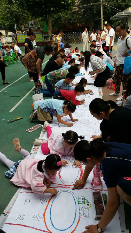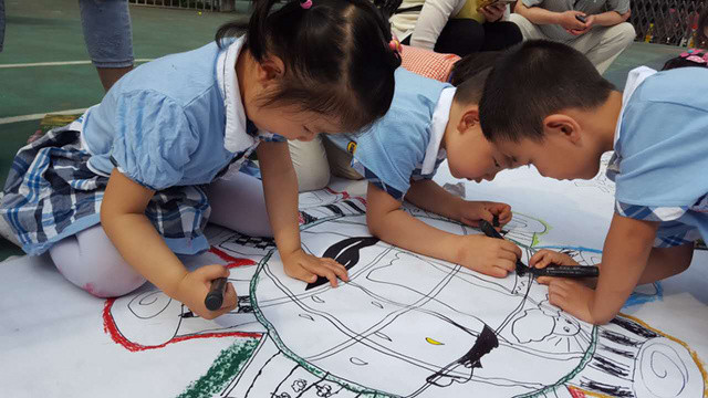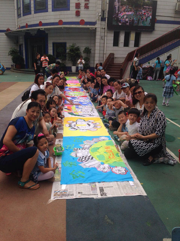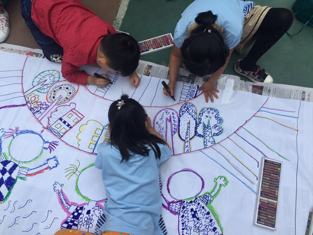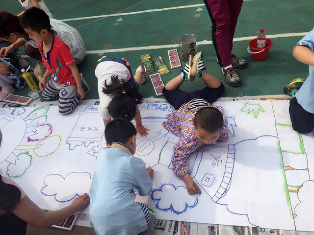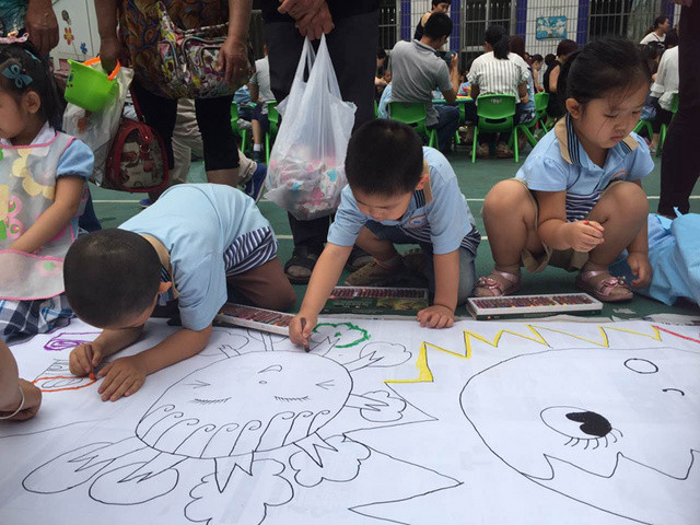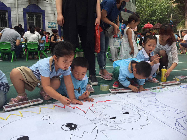 六一儿童节到来啦!在孩子们的节日里我园每年都会组织丰富多彩的节目。今年为了让这个六一过得更加有意义,我园举办了“庆六一”幼儿亲子画展活动。 绘画前,老师和孩子们讨论了自己班的绘画主题——保护环境,孩子们都对环保有着自己的想法,比如绿色出行、节约用水、多种树、垃圾要分类等等。因为我们班的特色是线描画,所以我们的绘画方式是先画好主题内容,再以线描画填充,用油画棒勾边,最后用颜料刷上背景色。这天早上大家相约集合在操场上,六一亲子画展活动正式开始了。太阳下孩子们一个个趴在画布上一笔一笔的勾勒着,都没有发现自己的汗水已经顺着脸颊滴在画布上,家长们也在旁边帮忙,大家都忙的不亦乐乎。不一会儿一张张充满着童心童趣的作品就完成了。大家一起用丰富的想象绘出了美好的未来,共同绘出心中美好的绿色家园。 这次的六一我园除了开展亲子画展活动外,还请孩子们欣赏了精彩的木偶剧表演,给孩子们准备了六一礼物——篮球,每一个小朋友都会拥有一个属于自己编号的篮球,希望孩子们能过一个轻松、快乐、健康并有意义的六一儿童节!