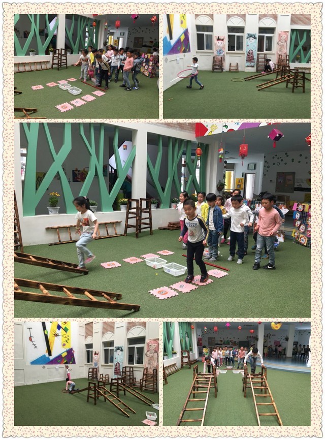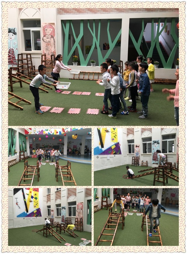 游戏目标: 1、 能遵守游戏规则,听指令游戏。 2、 提高身体的协调性和攀爬能力。 3、 乐于参加体育竞赛游戏,体验游戏的乐趣。 游戏准备: 户外场地、数字垫子、框子三个、瓶盖、梯子、呼啦圈两个等。 游戏玩法: 幼儿分成男女两队站在起点,每组都有设有一个赛道。分别请两队的排头将5个瓶盖投入各自的框中方可从起点出发,随后跳过泡沫垫(单数单脚跳,双数双脚跳),在爬过梯子,然后转动哗啦圈走到终点将手印在手印上,速度最快的为胜利者,方可记上一份,接着回到自己的队伍与队友拍手第二位幼儿接着游戏,最后分数相加最高的一组便是冠军。
