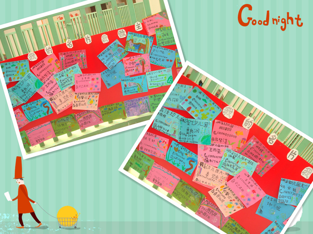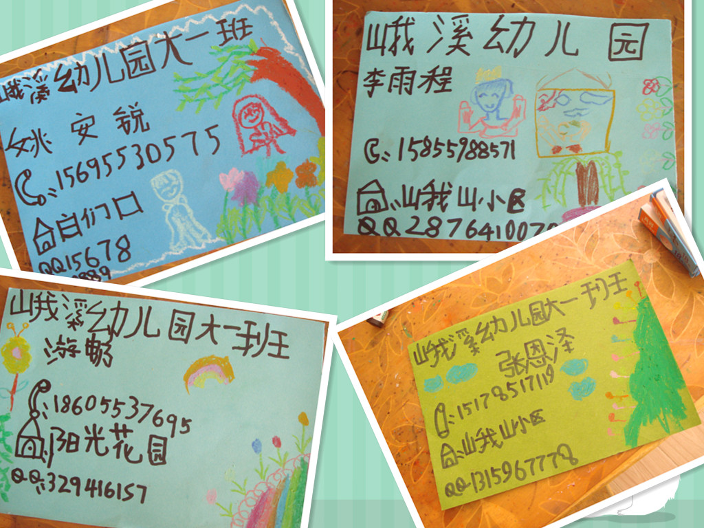 名片,是当代社会交往中一种简单的、经济实用的介绍性工具。在现代职场上,一张小小的名片能起到无法估量的作用。《纲要》中指出要“引导幼儿接触周围环境和生活中美好的人、事、物,丰富他们的感性经验和审美情趣,激发他们表现美、创造美的情趣。”我想,随着名片使用日益广泛,我们应该让幼儿了解社会,与现实生活接轨,因此,我们设计了本次活动《我的名片我做主》。活动的开始部分,老师首先指导孩子们认识各种各样的名片,使其简单地了解名片的内容和用途,知道名片可以让我们认识更多朋友,懂得怎样正确使用名片,大胆地表达自己的情感。接下来,让孩子们自己设计出各具特色的富有个性的名片,学着写出自己的名字和家庭住址。没想到,孩子们写得还真不错,爸爸妈妈们看看是不是那回事啊!